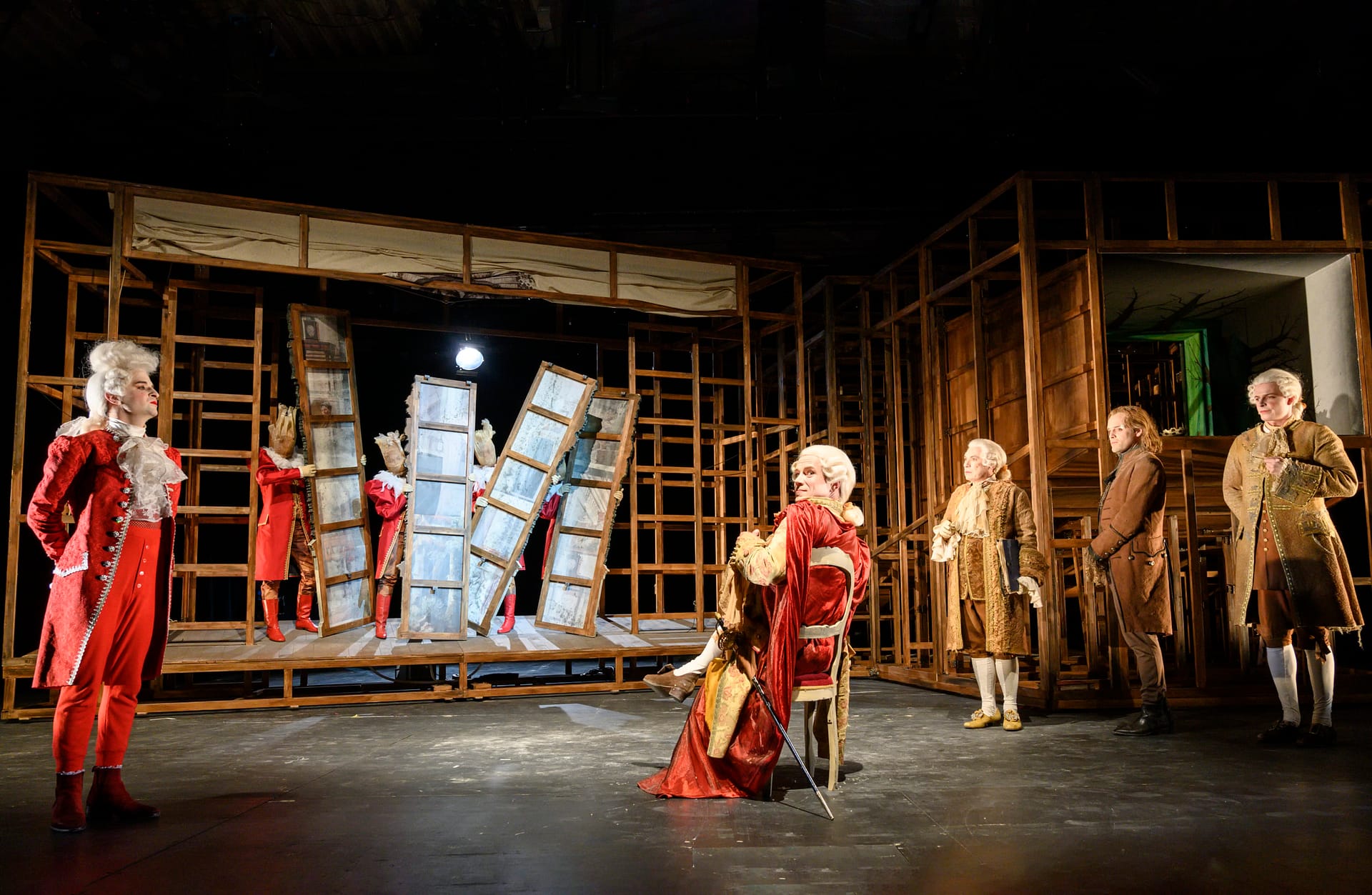 Shaffers Schauspiel über den »halben Augsburger« Wolfgang Amadeus und den abwesenden, aber als steinerner Gast unablässig beeinflussenden Augsburger Leopold kommt nach fast 40 Jahren wieder in die Mozartstadt. David Ortmanns Inszenierung im martini-Park pustet erfrischend den Staub der Geschichte hinfort, verarbeitet lebendig heutige Erkenntnisse über Mozart und lässt selbstverständlich auch Mozarts unsterbliche Musik erklingen.